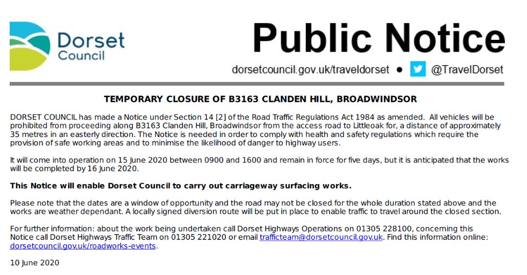 Clan Hill closed next week. email: trafficteam@dorsetcouncil.gov.uk #StayAtHome #StaySafe Share this: Share on X (Opens in new window) X Share on WhatsApp (Opens in new window) WhatsApp Print (Opens in new window) Print Share on Facebook (Opens in new window) Facebook Like this:Like Loading...
