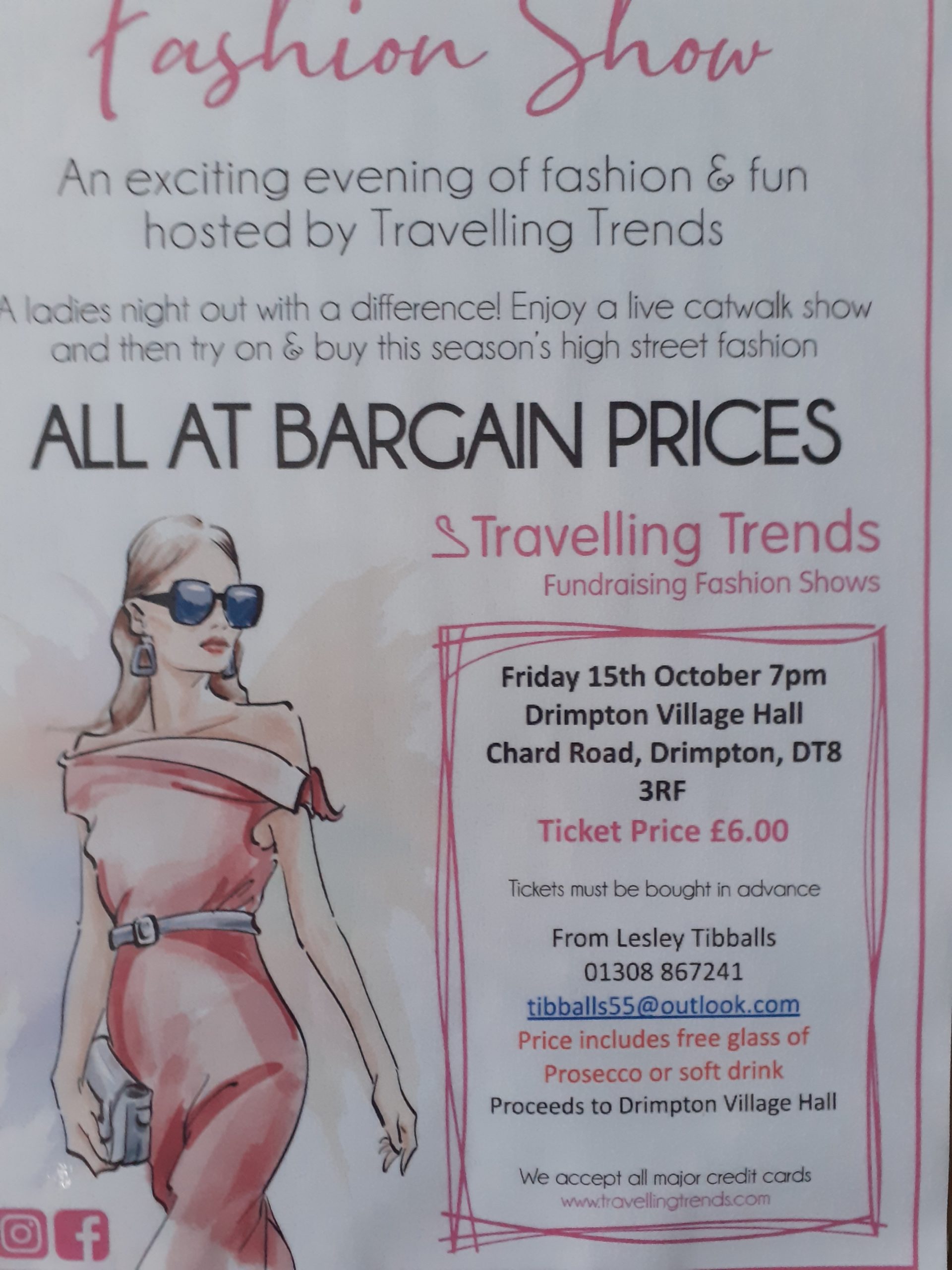 Travelling Trends Fashion will be at Drimpton’s Village Hall on Friday 15th October. The show starts at 7pm.