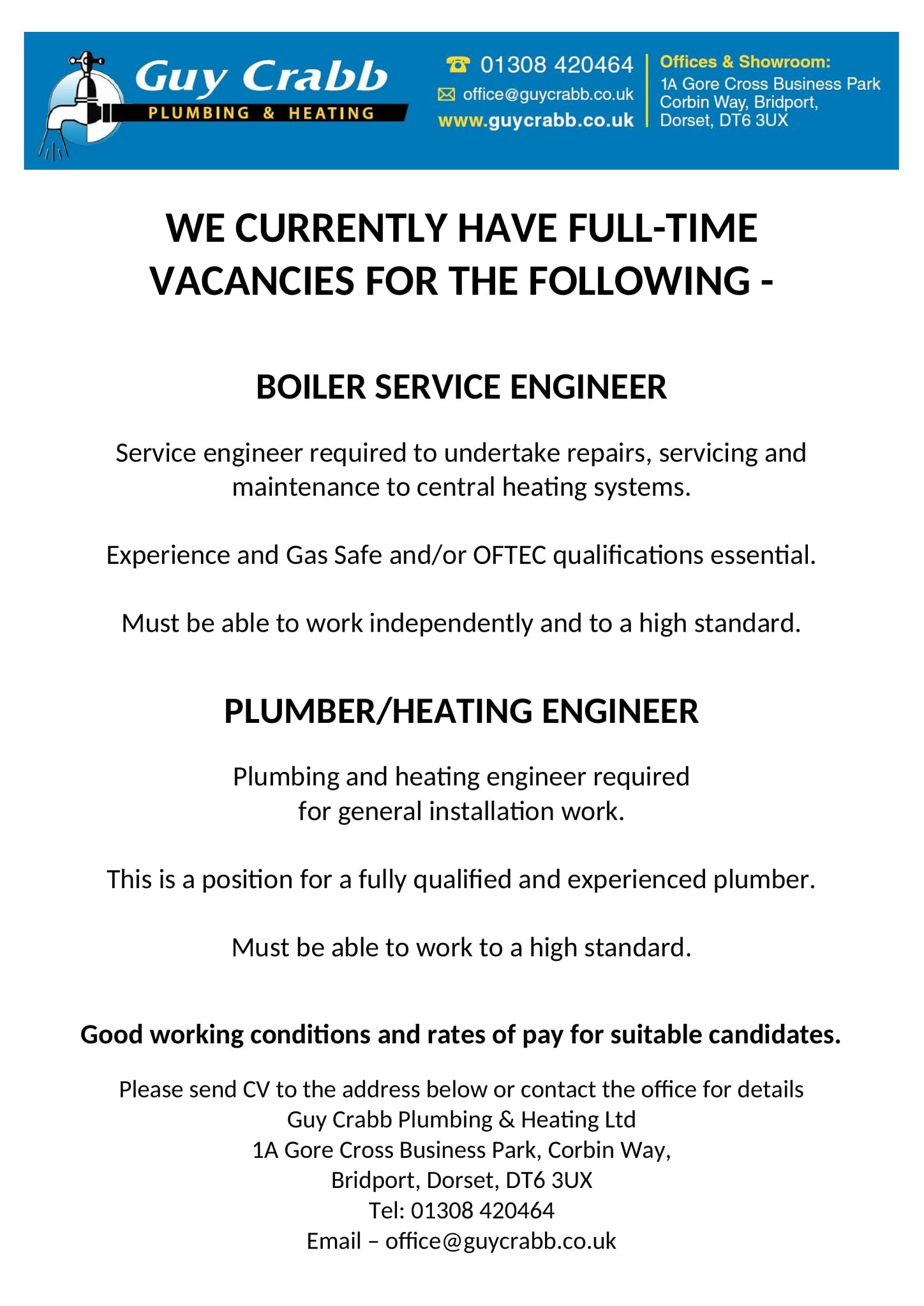 Guy Crabb Plumbing & Heating Ltd need recruits to join their team in Bridport.