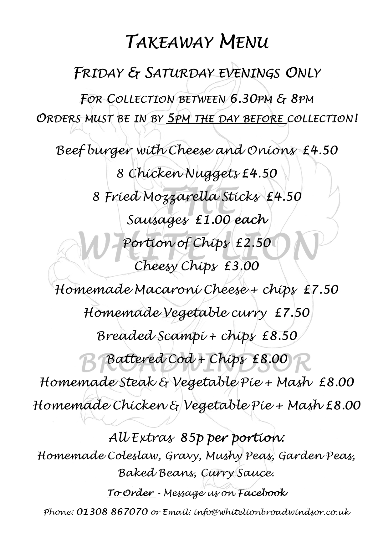 All takeaways must be ordered the day before – call 01308 867070 or message them through Facebook.
