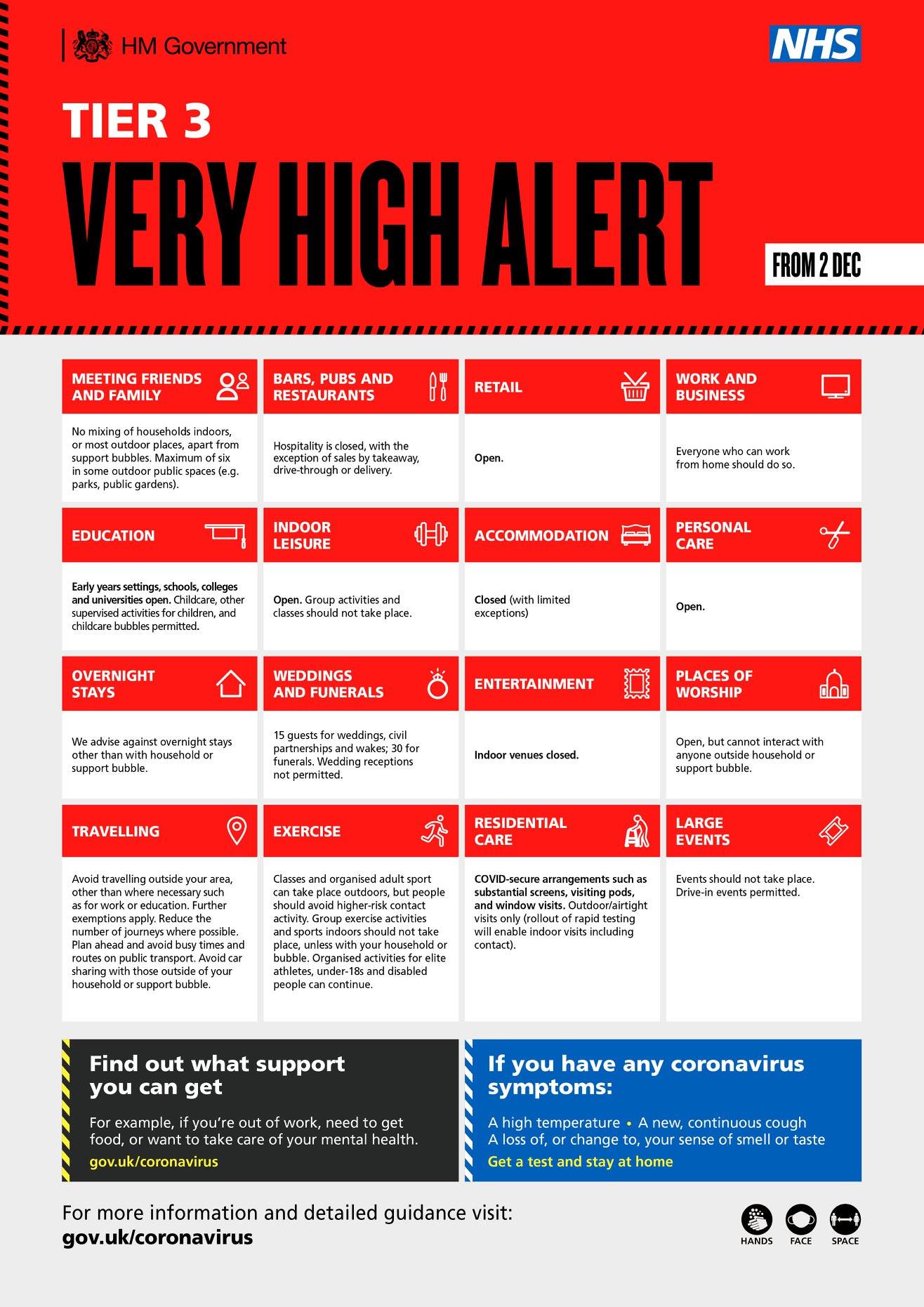 Health Secretary Matt Hancock has announced where we are in the Government’s 3 tier system (as shown below), when the National Restrictions end on 2nd December.
