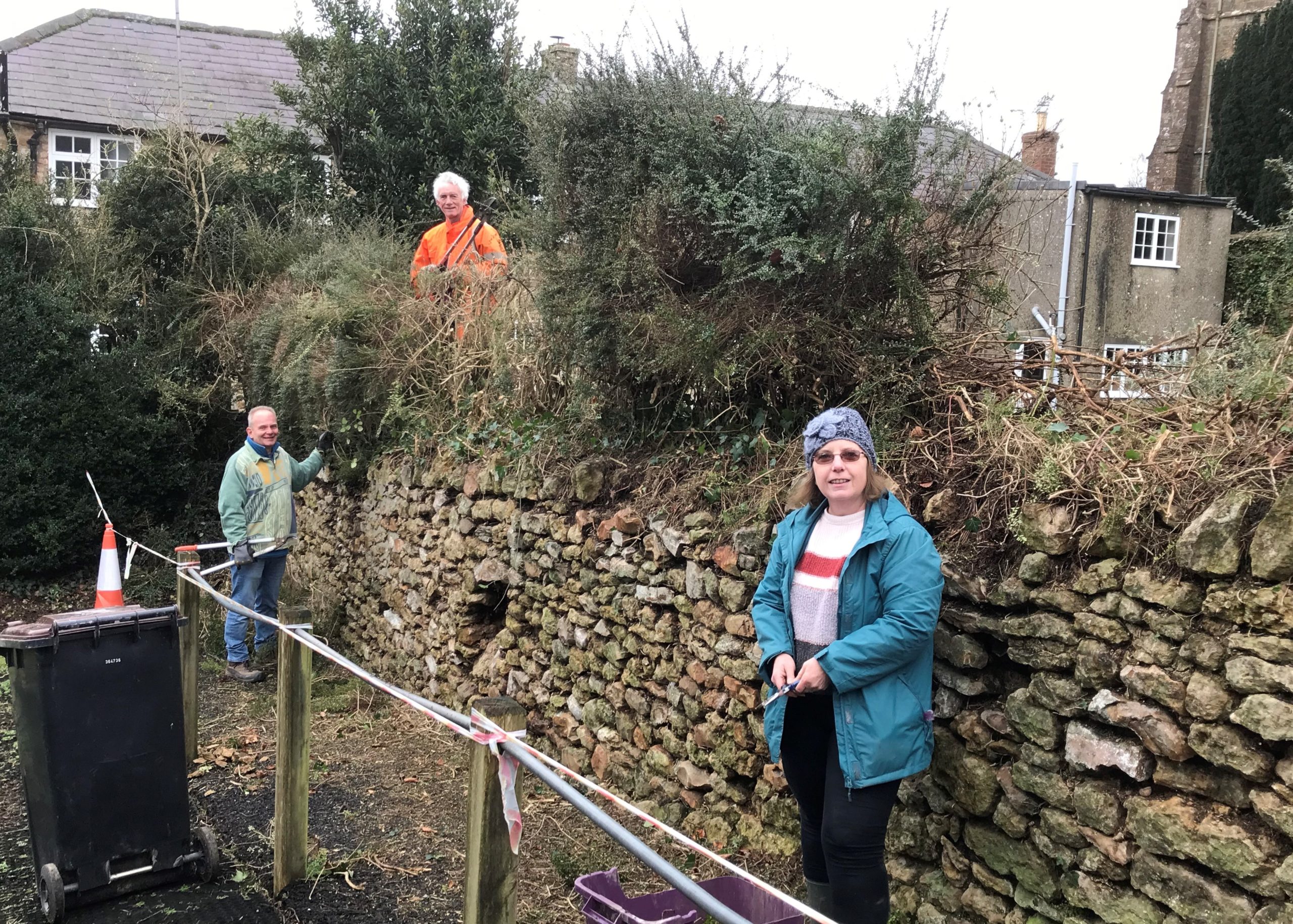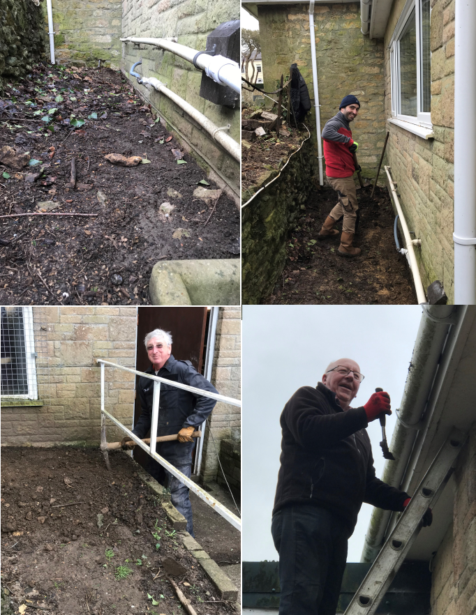 It wasn’t just Chris working this morning – there were many busy and active people working in the sunshine and cold at Bernards’ Place. Lots of digging and more clearing of the guttering and hedges. They made excellent progress.
