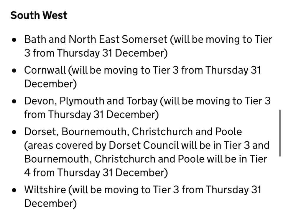 These areas will enter a new tier 4, which will be broadly equivalent to the national restrictions which were in place in England in November.