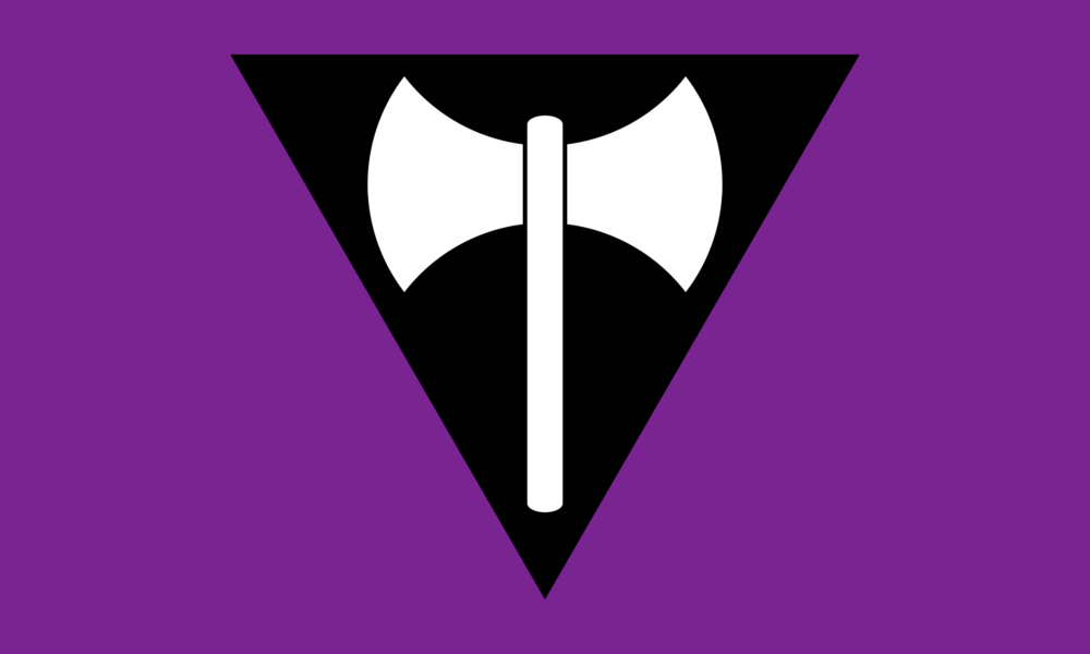 2. The Labrys flag, features a battle-axe on a dark purple background.  The colour purple, or lavender is long associated with lesbianism as is the colour of violets – a flower historically used by lesbians to indicate themselves to other lesbians.