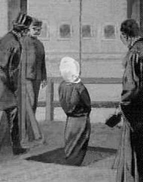 Precisely at 8am, the prison bell peeled forth it’s solemn and warning knell. The procession then appeared from the prison slowly wending their way to the scaffold which was situated some distance away. Martha was described as behaving with much fortitude right up to he last moment. Martha had chosen a long, tight fitting thin black silk dress for her hanging. At the prison gates, she shook hands with the officials and began the ascent to the gallows set up over the gateway. Martha walked up the first flight of 11 steps where William Calcraft, a forbidding figure in his black clothes and bushy white beard, pinioned her arms in front of her before leading her up the next flight of 19 steps, across a platform and on up the last flight of steps to the actual trap. Here Calcraft put the white hood over Martha’s head and the simple noose around her neck. He then began to go down below the trap to withdraw the bolts (there was no lever in those days). When it was pointed out to him that he had not pinioned Martha’s legs, he returned to her and put a strap around her legs, outside of her dress to prevent it billowing up and exposing her as she hanged. (The Victorian preoccupation with decency!) While this was going on, Martha stood stoically on the gallows, supported by a male warder on each side just waiting for her death. The rain made the hood damp and it clung to her features, giving her an almost statuesque appearance. It must also have made it hard for her to breath through the damp cloth.